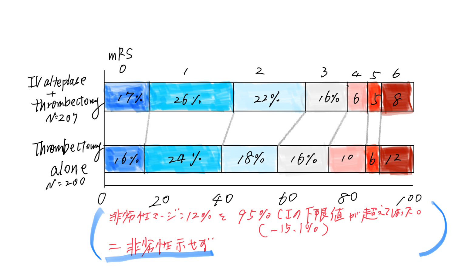 5/201 (脳血栓回収療法のみ) vs. 7/202 (tPA + 脳血栓回収療法)